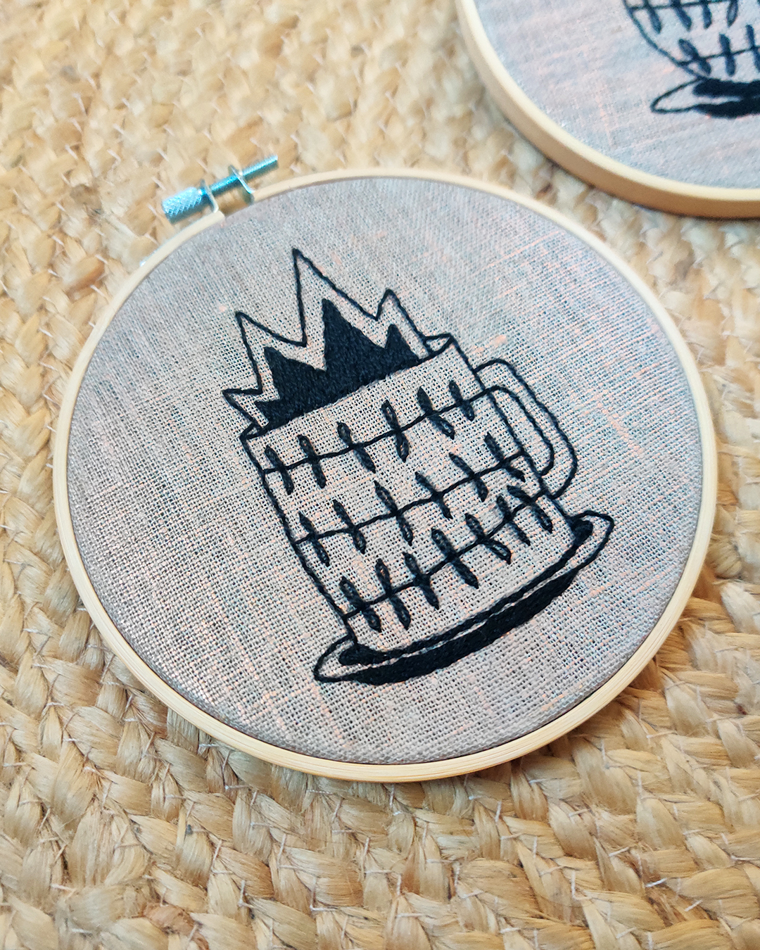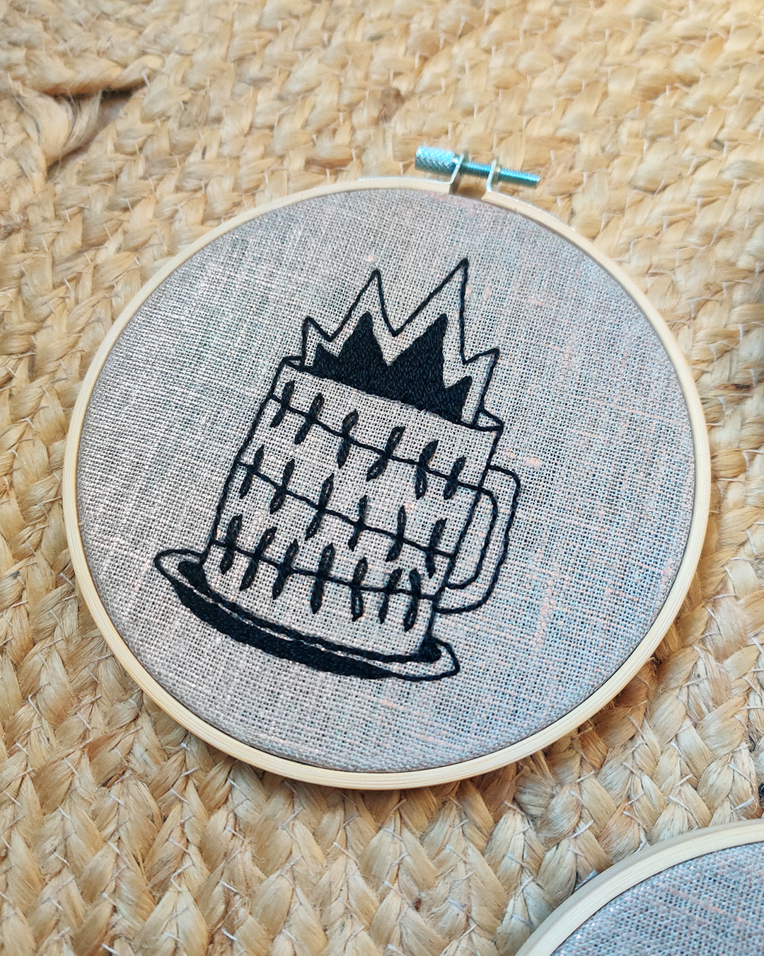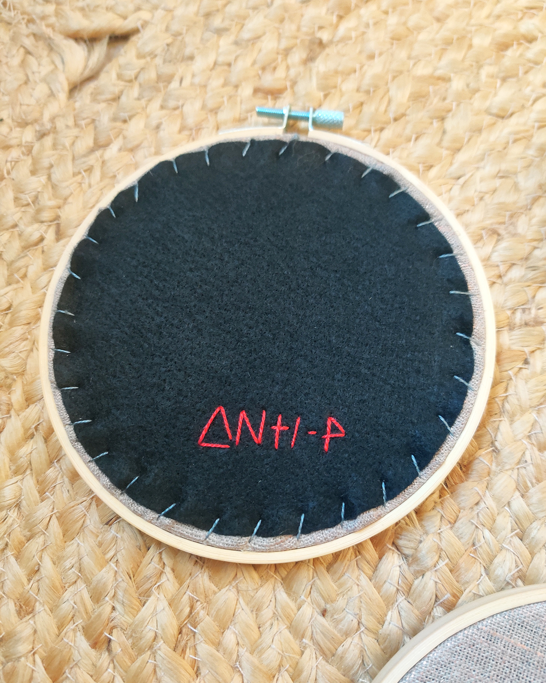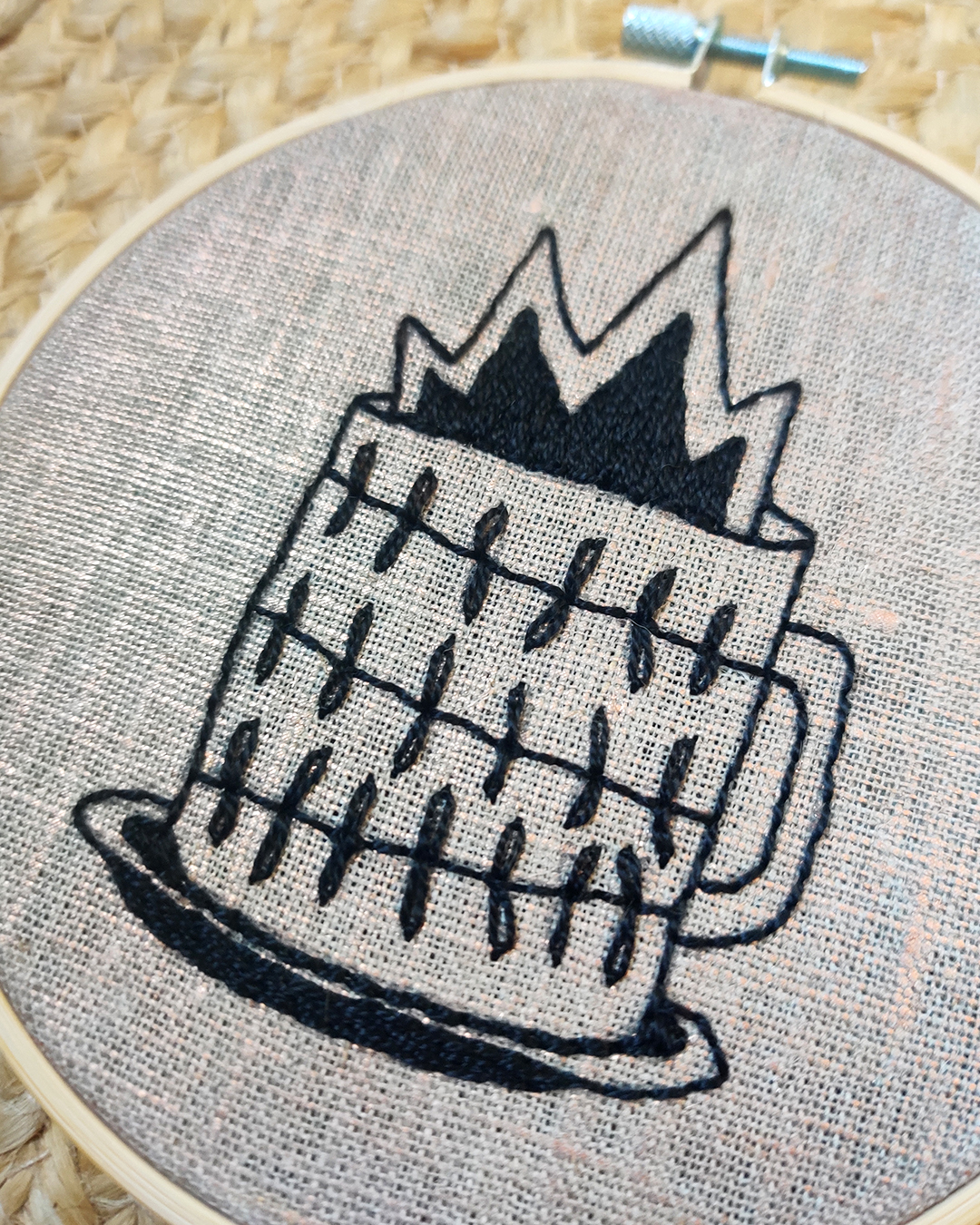 La toile utilisée est en lin ciré scintillant à la lumière, et les fils sont en coton. La broderie est fermée à l’arrière avec de la feutrine 100% polyester.