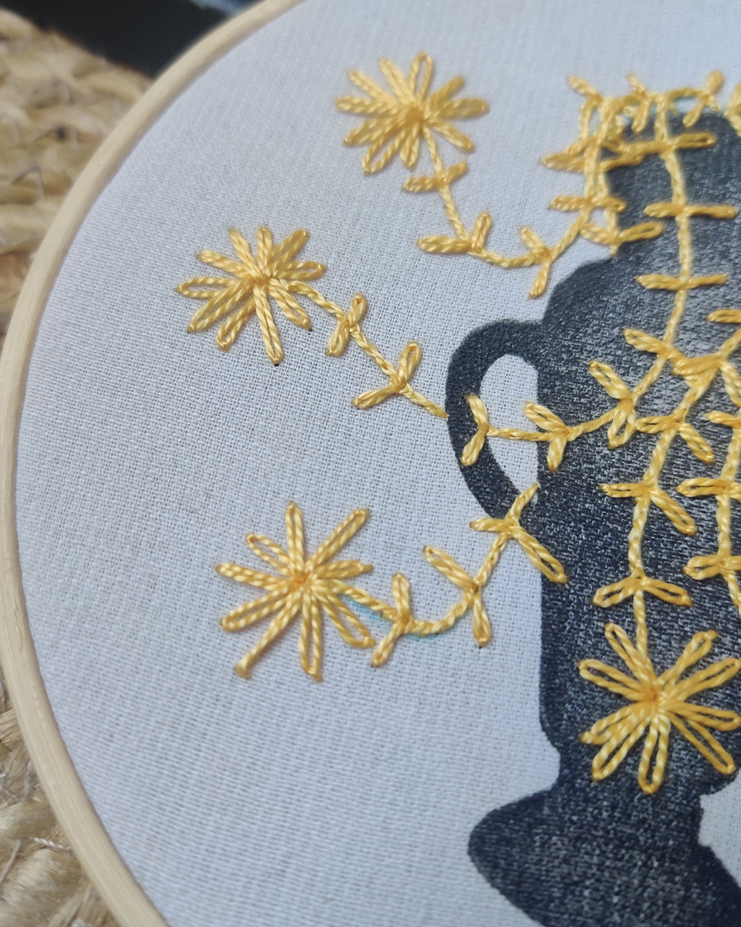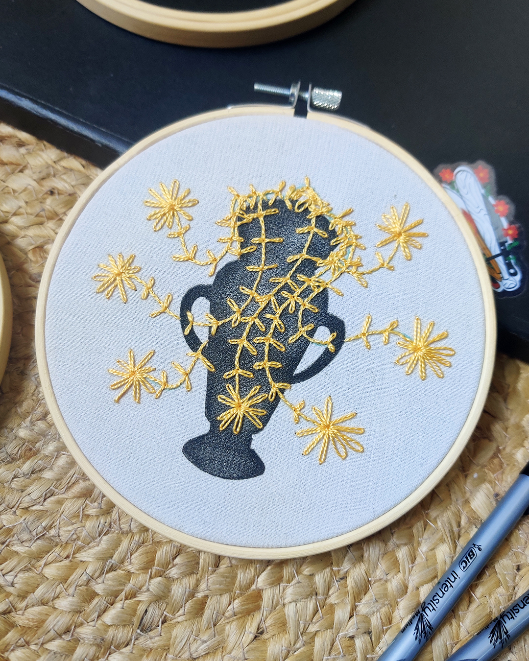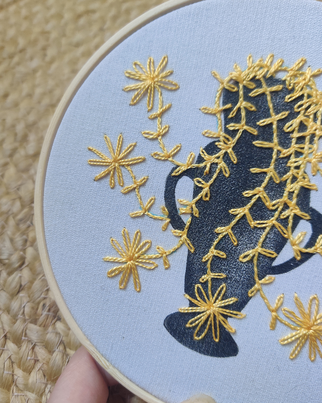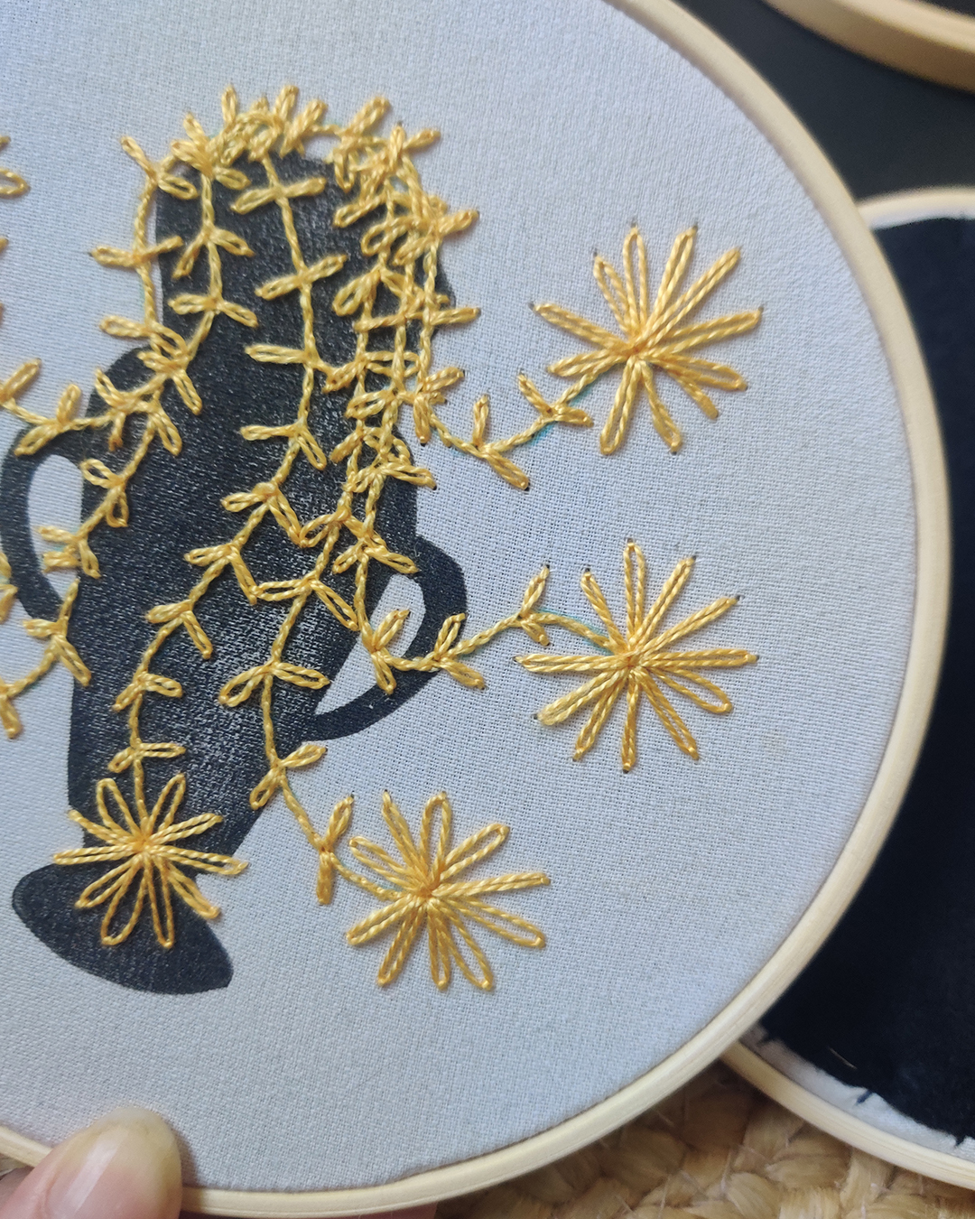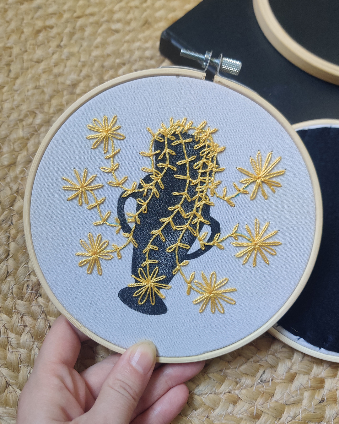 La toile utilisée et les fils sont en coton. La broderie est fermée à l’arrière avec de la feutrine 100% polyester. La gravure résiste à l’eau mais cette plante n’a pas besoin d’être arrosée.