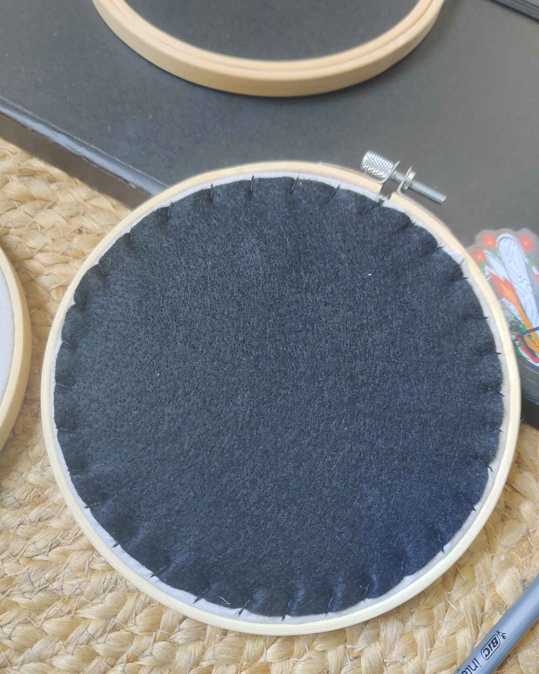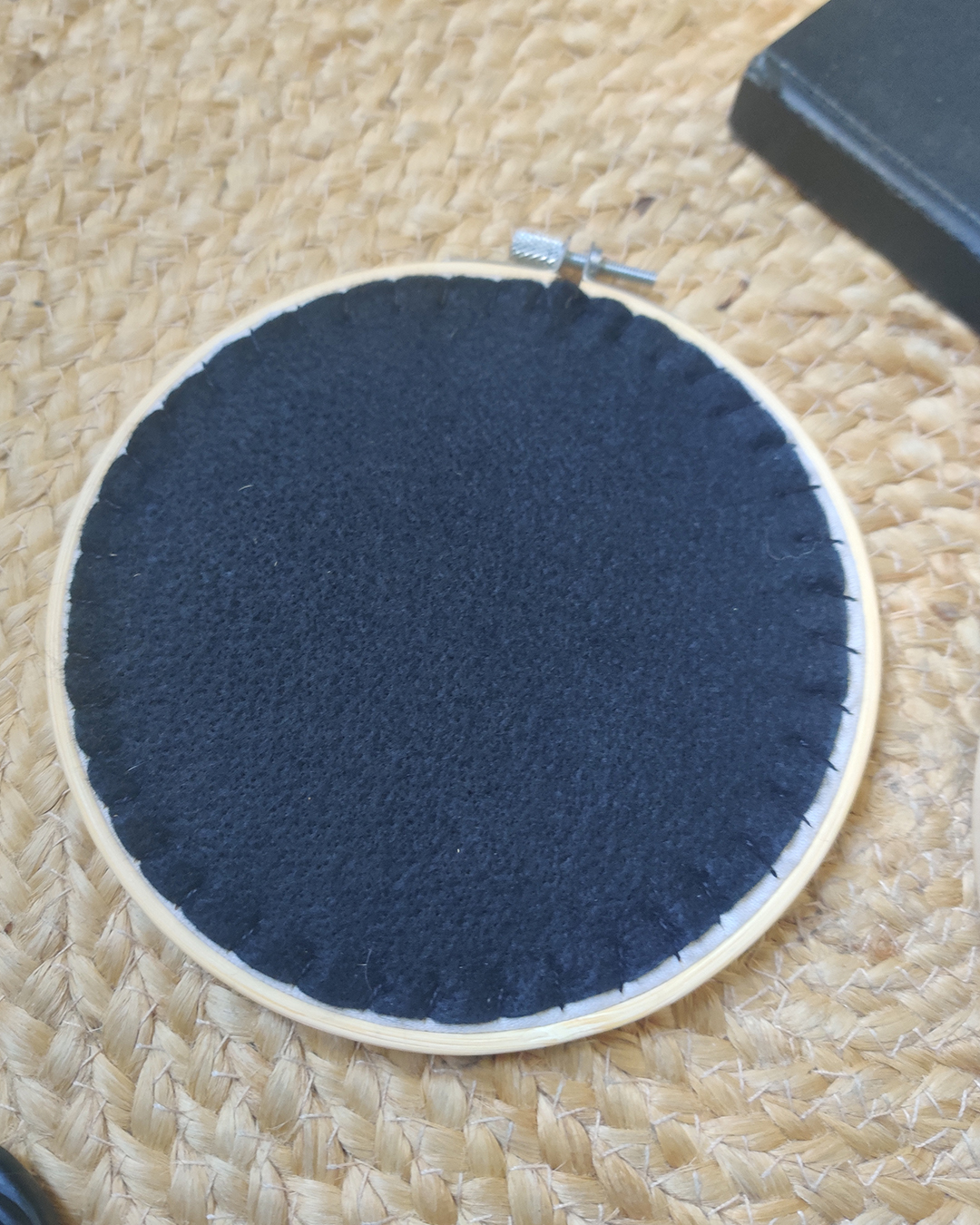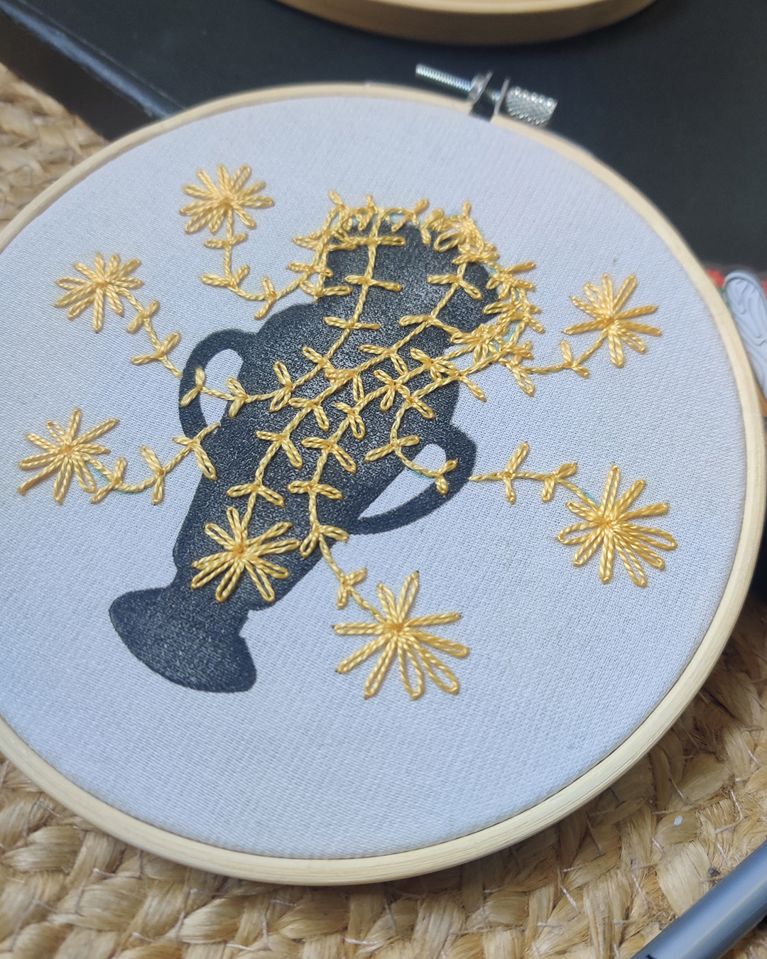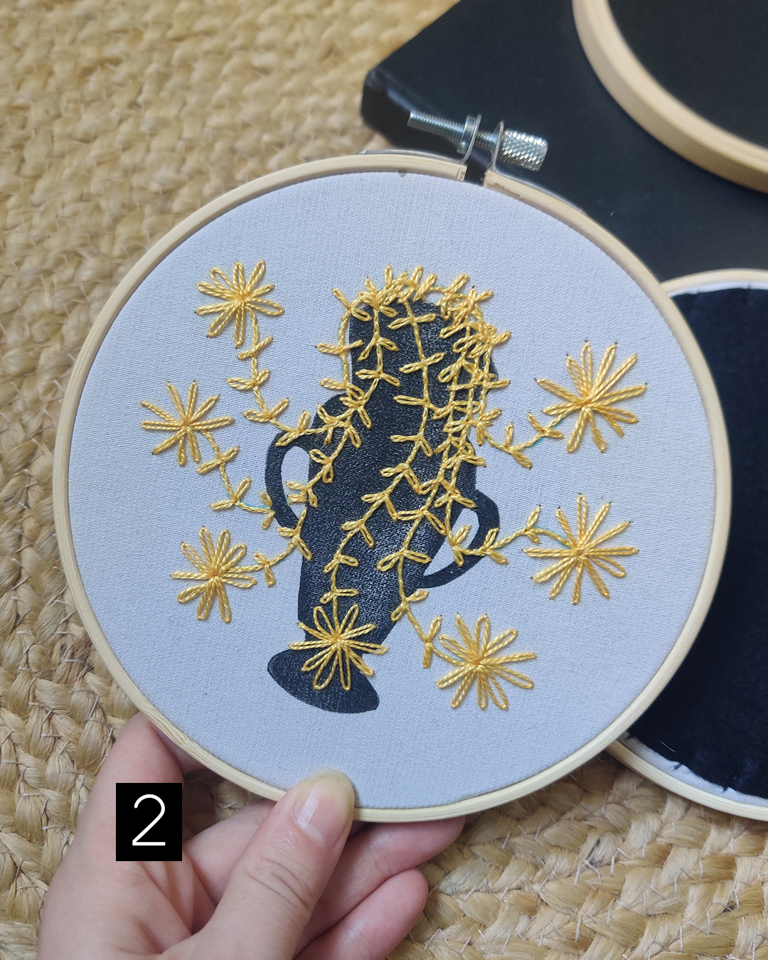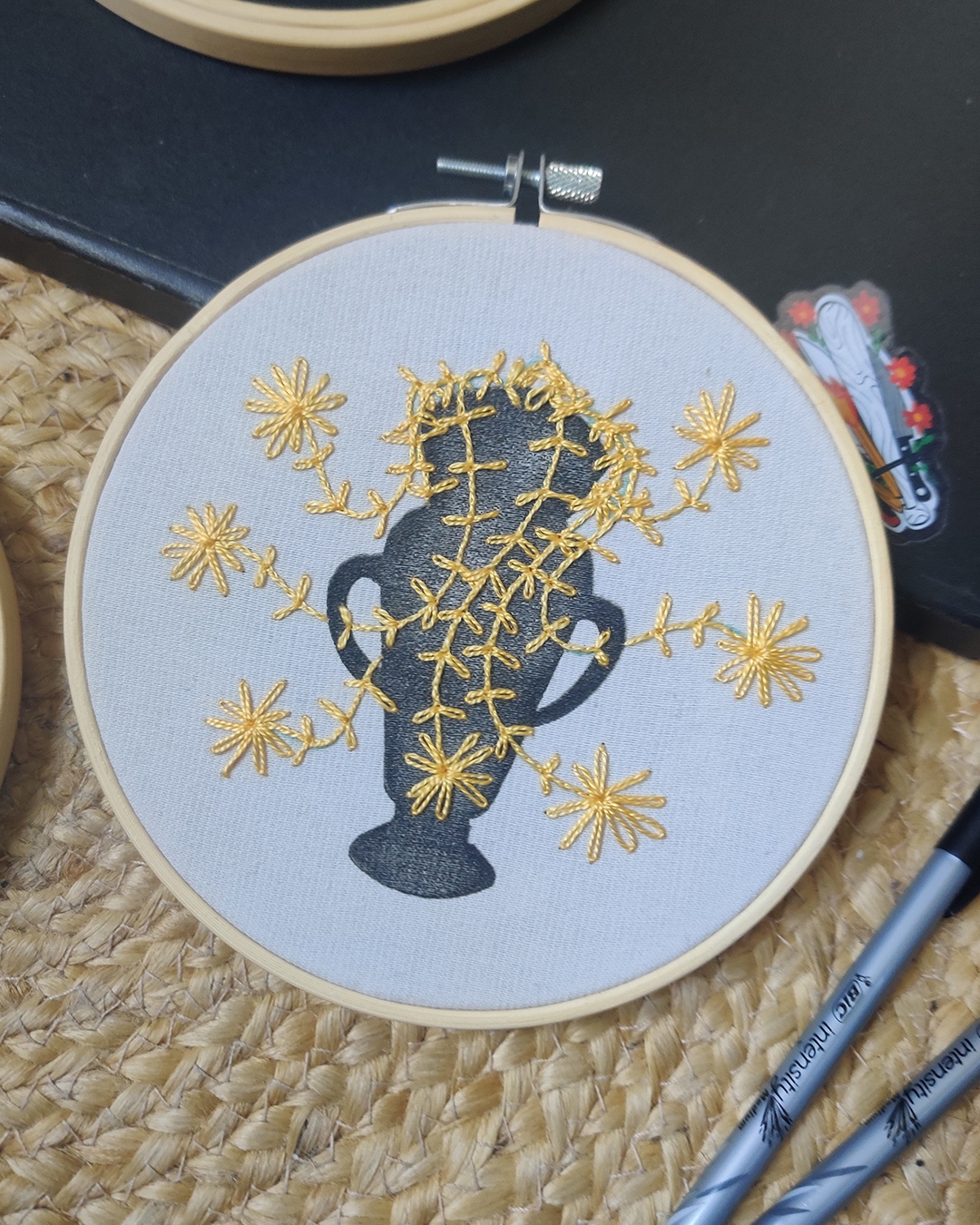 La toile utilisée et les fils sont en coton. La broderie est fermée à l’arrière avec de la feutrine 100% polyester. La gravure résiste à l’eau mais cette plante n’a pas besoin d’être arrosée.